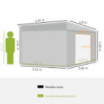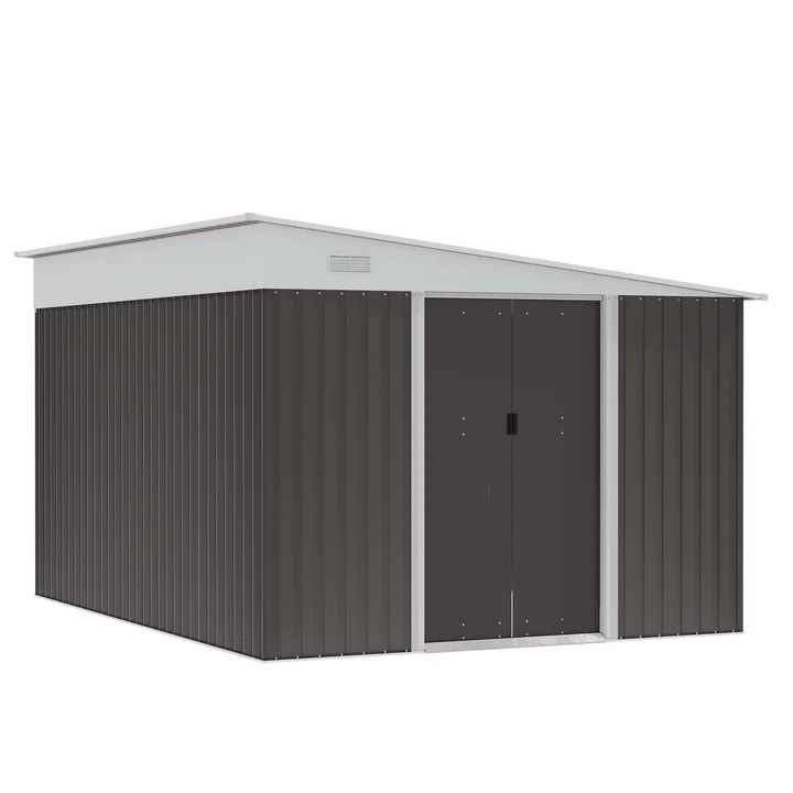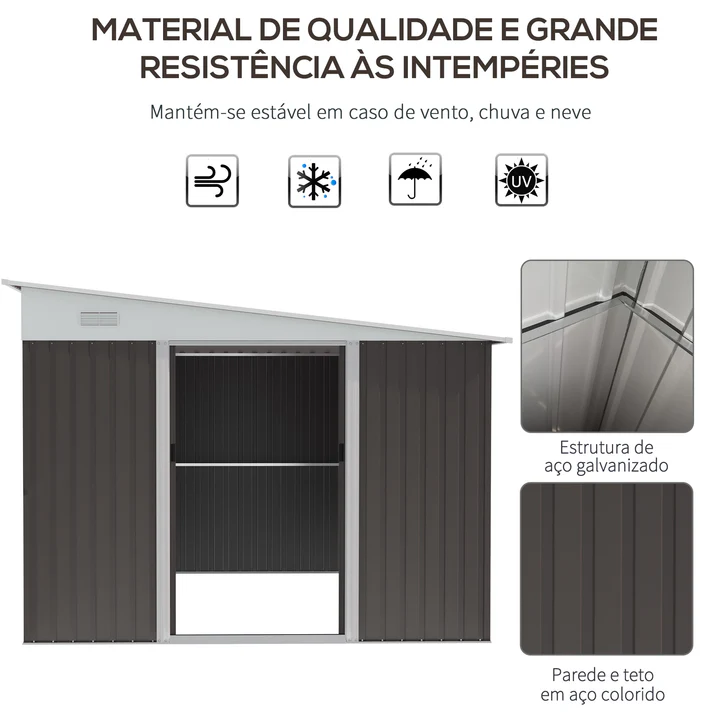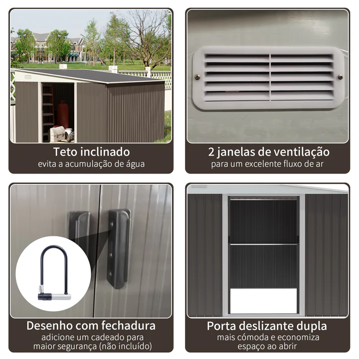 • 201 cm (CxLxA). Medidas da base: 333×268 cm (exterior), 317×257 cm (interior). Requer montagem Adicione espaço de armazenamento com este abrigo de exterior da Outsunny. Este abrigo metálico é a solução ideal para ter no seu jardim ou terraço, para guardar ferramentas, utensílios de jardinagem e muito mais. Um abrigo de metal tem vantagens diferentes em relação aos de madeira, não apodrece com a humidade nem com o passar do tempo, é à prova de fogo e quase não requer manutenção. Graças à sua estrutura em aço galvanizado, respiros e porta dupla de correr, você terá um abrigo por anos