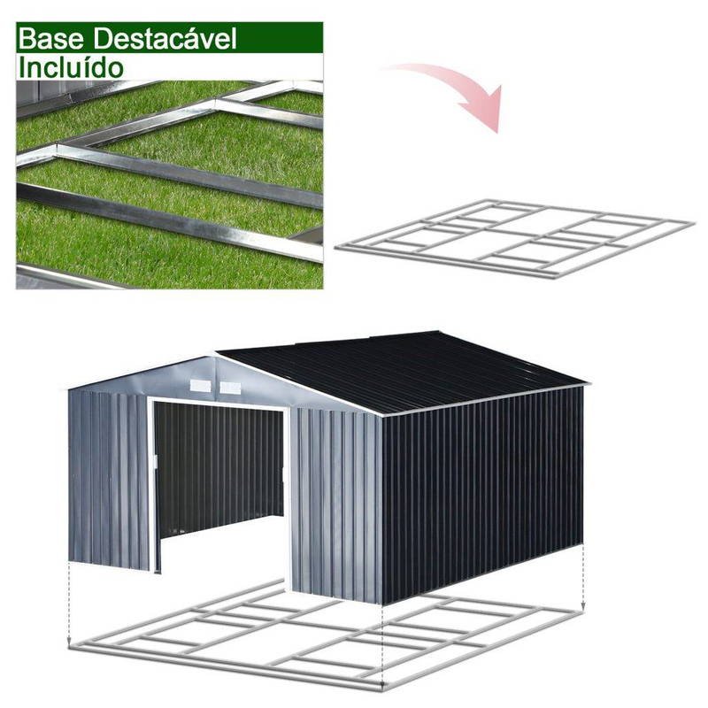 Se procura um grande armazém, este da Outsunny oferece-lhe uma área útil de mais de 12 metros quadrados. Para manter suas ferramentas de jardim, bicicletas e outros itens ao ar livre organizados. Fabricado em aço galvanizado, oferece uma estrutura resistente, além disso, possui uma base de reforço para que você possa colocar alguns de seus itens em cima e não entrar em contato direto com o solo. Seu telhado inclinado evita que a água estagnasse e causasse ferrugem. As suas grandes dimensões tornam este armazém o espaço ideal para utilizar como canteiro de obras.