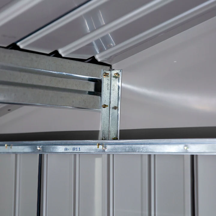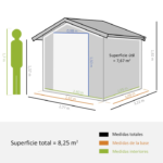 Graças às alturas generosas das paredes (~198 cm) e da cumeeira (~246 cm), o volume interior é apreciável e permite organizar o espaço com prateleiras ou equipar o abrigo de acordo com as suas necessidades.