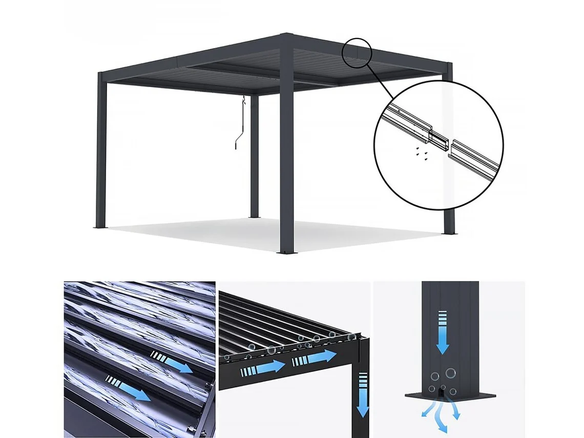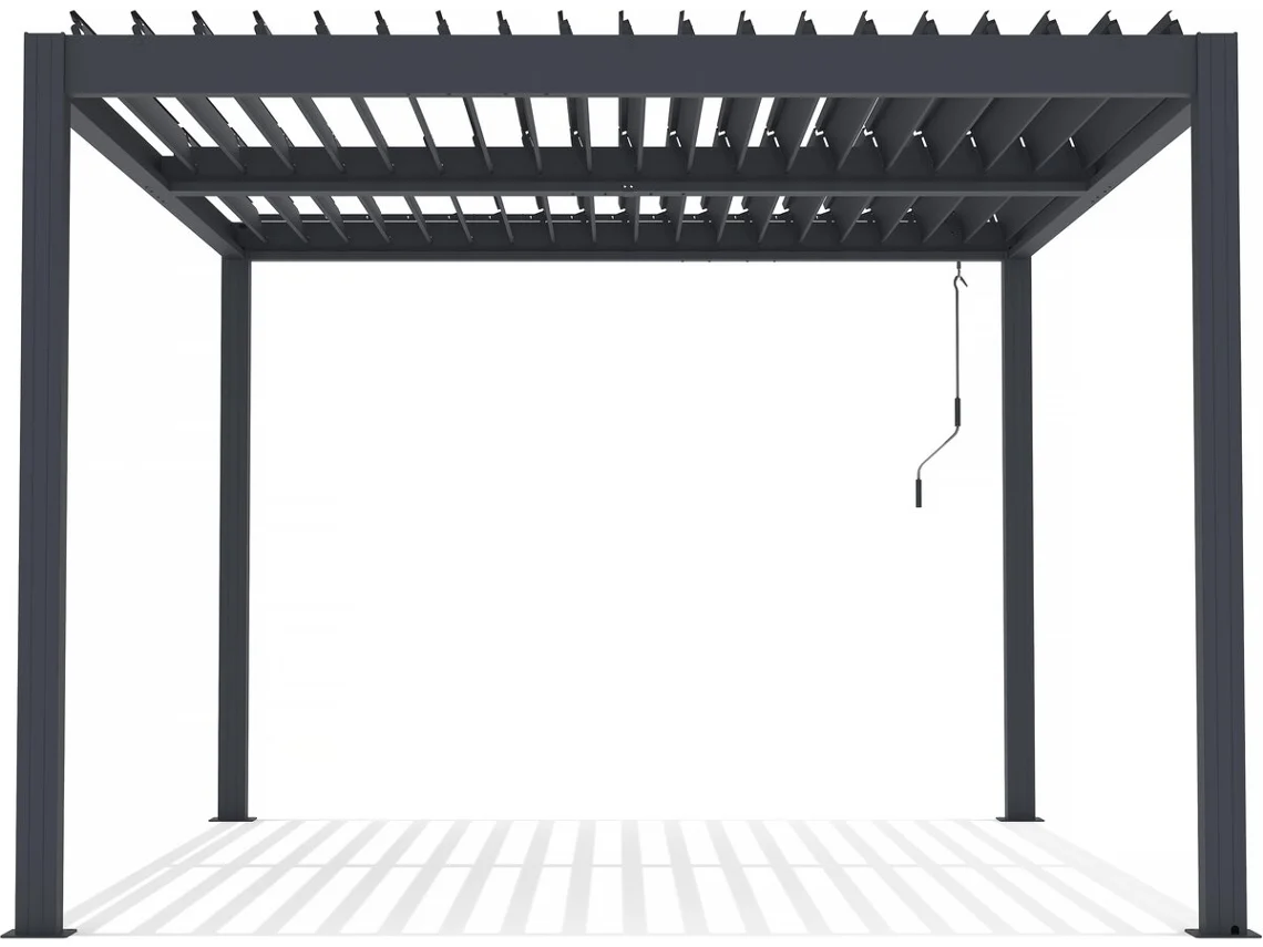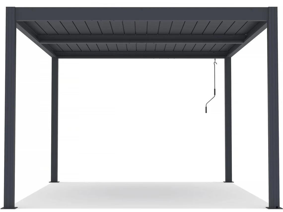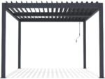 conçue pour résister aux intempéries. Cet abri allie élégance et fonctionnalité pour sublimer votre terrasse ! Sa couleur gris foncé s’intègre harmonieusement à tous les jardins, et son toit entièrement étanche s’ouvre et se ferme grâce à ses lames inclinables actionnées par une manivelle. L’évacuation des eaux pluviales est assurée par un système innovant qui les canalise à l’intérieur des poteaux.
