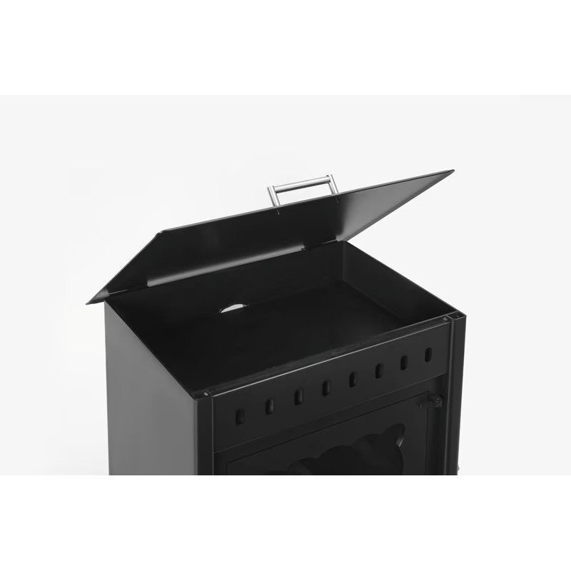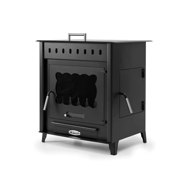 É um Fogão Tradicional com Grande Espessura de Aço Para Maior Potência Térmica e Durabilidade. Possui grelha grande em ferro fundido, gaveta que recolhe as cinzas e é confortável para sua extração. Bem como gancho ou saída de fumaça traseira. Os puxadores e maçanetas são fabricados em aço inox para maior vida útil. A parte superior com tampa inclui um pequeno forno. Este fogão também inclui uma porta lateral que reduz significativamente a saída de fumaça ao alimentar a combustão.