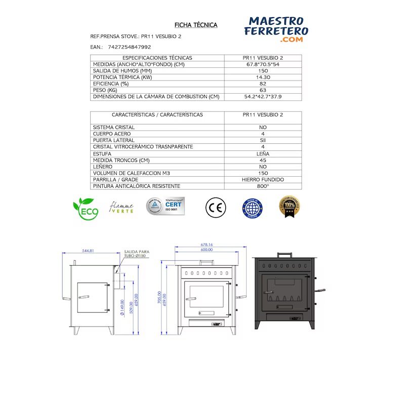 PRENSA STOVE – Fogão a lenha grande com forno e porta lateral Modelo VESUBIO 2 de 14,3 kW