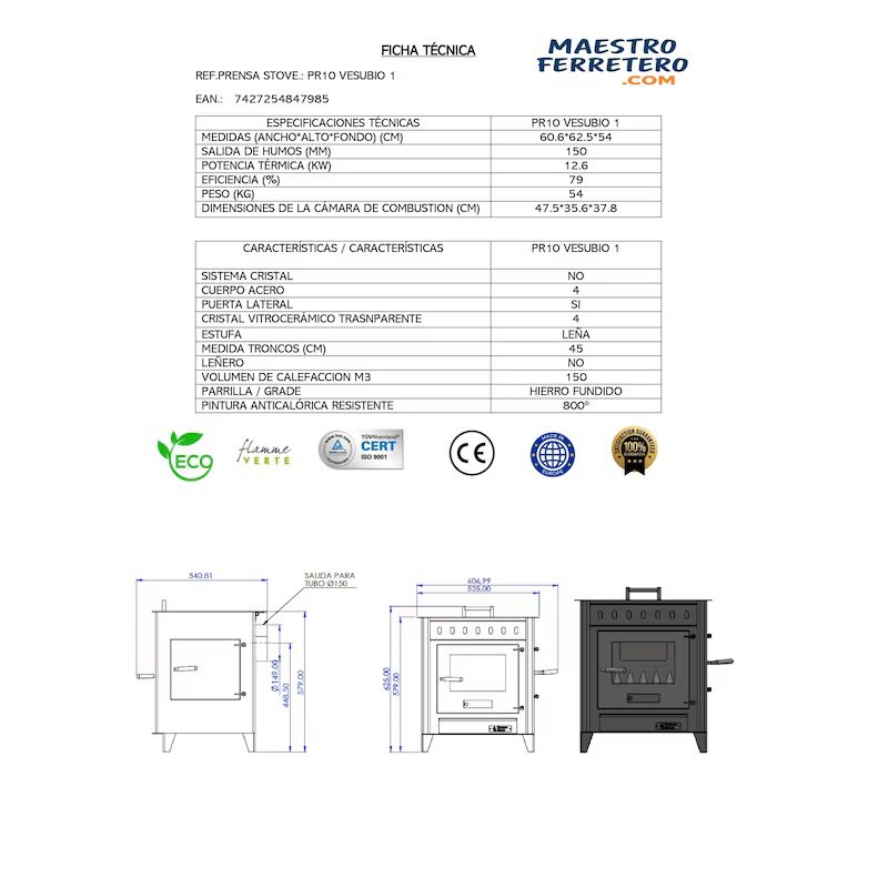 PRENSA STOVE – Fogão a lenha médio com forno e porta lateral Modelo VESUBIO 1 de 12,6 kW