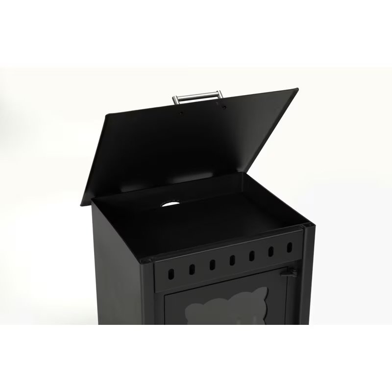 Porta em ferro fundido, gaveta para cinzas removível e compartimento para lenha