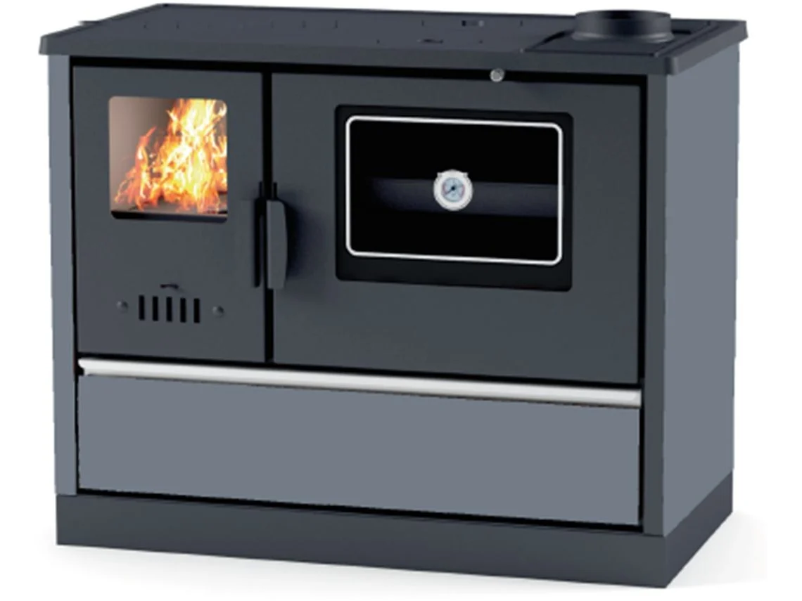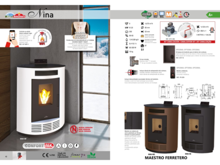 Dupla combustão, ar ventilado, dimensões compactas, fácil manutenção, programável, cadinho em ferro fundido , sensor ambiente integrado, muito silencioso, cinzeiro removível, saída de fumos na parte traseira.