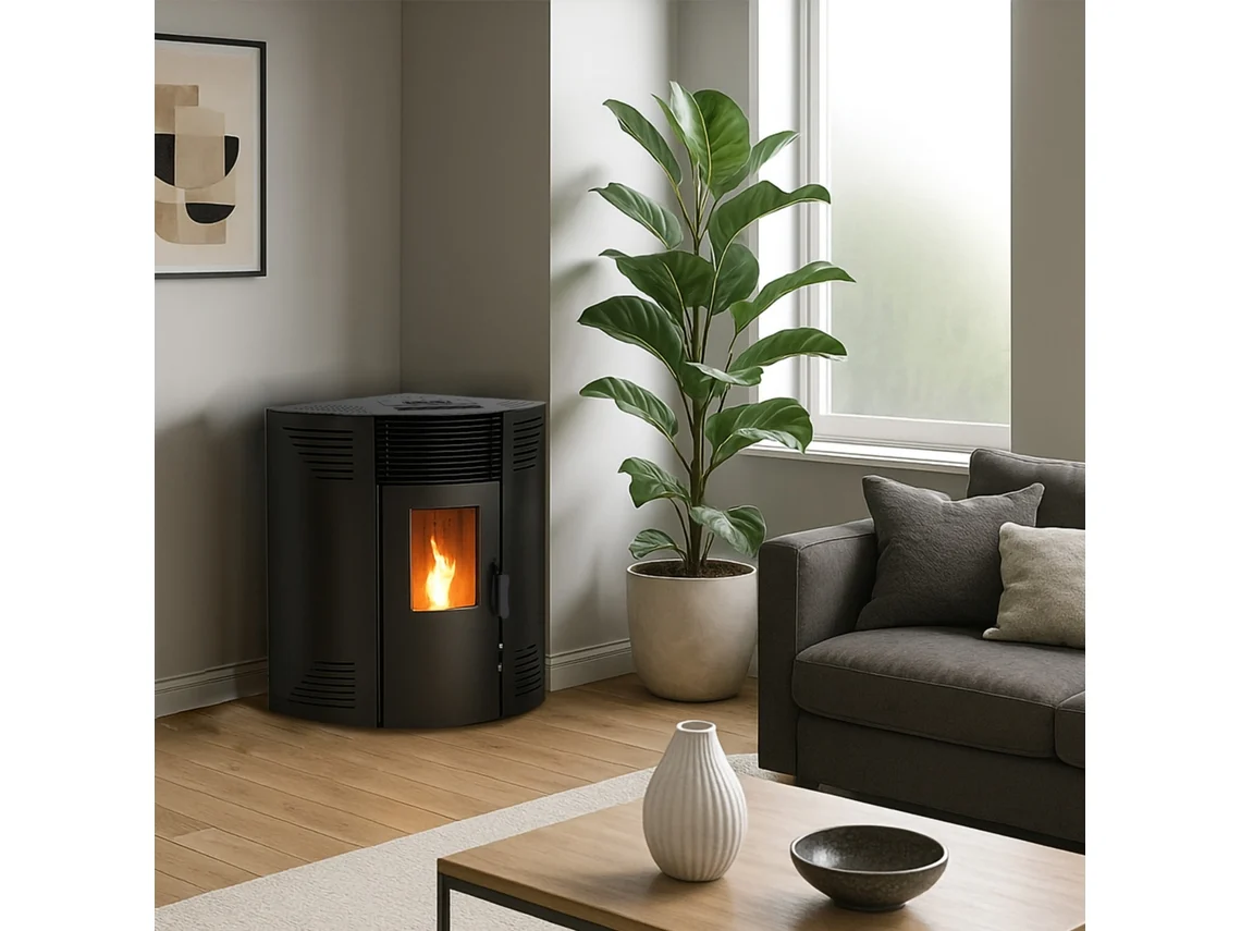 Combine potência, conforto e design contemporâneo com este fogão a pellets de canto, ideal para aquecer eficazmente grandes volumes, ao mesmo tempo que poupa energia.